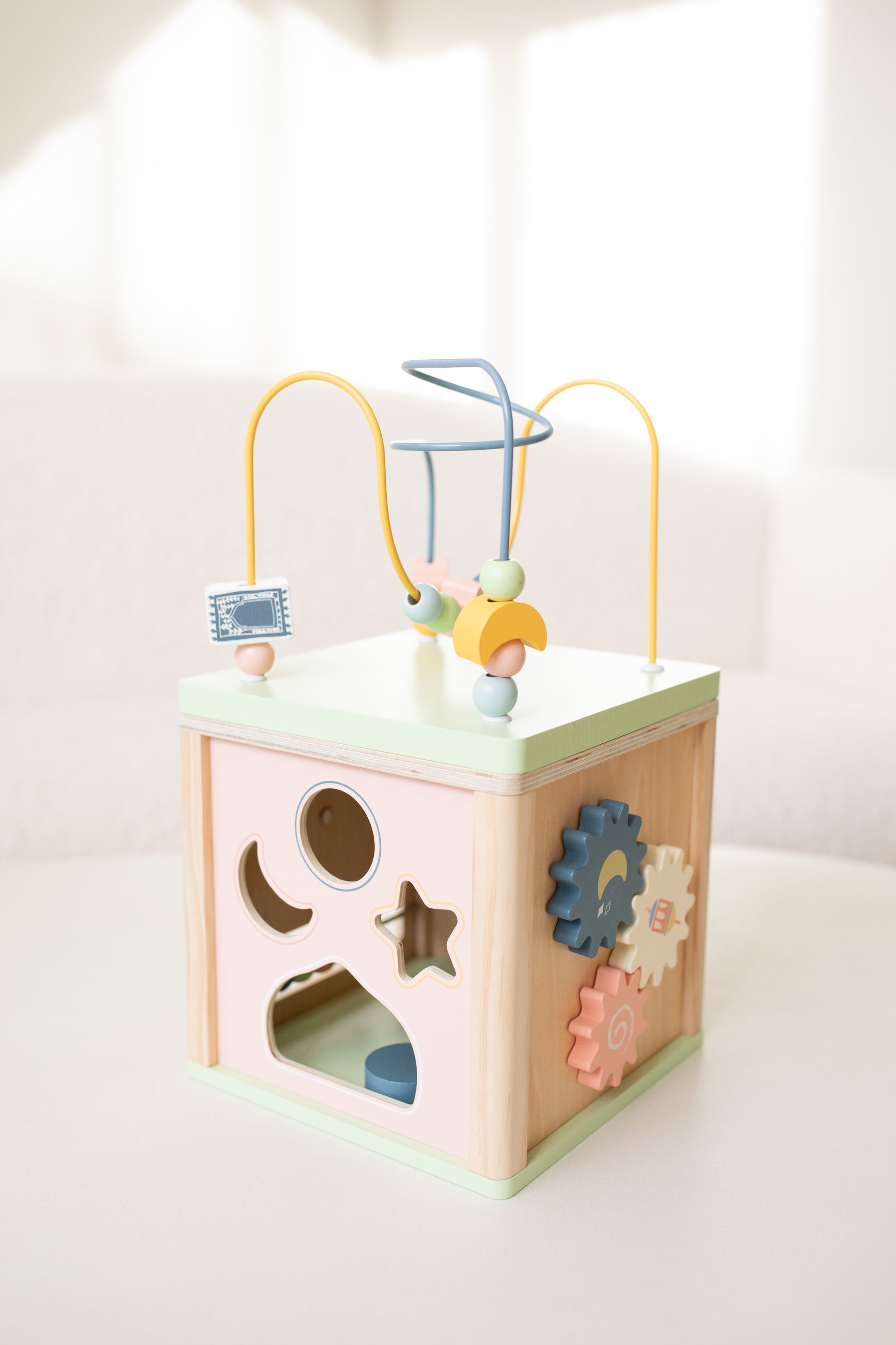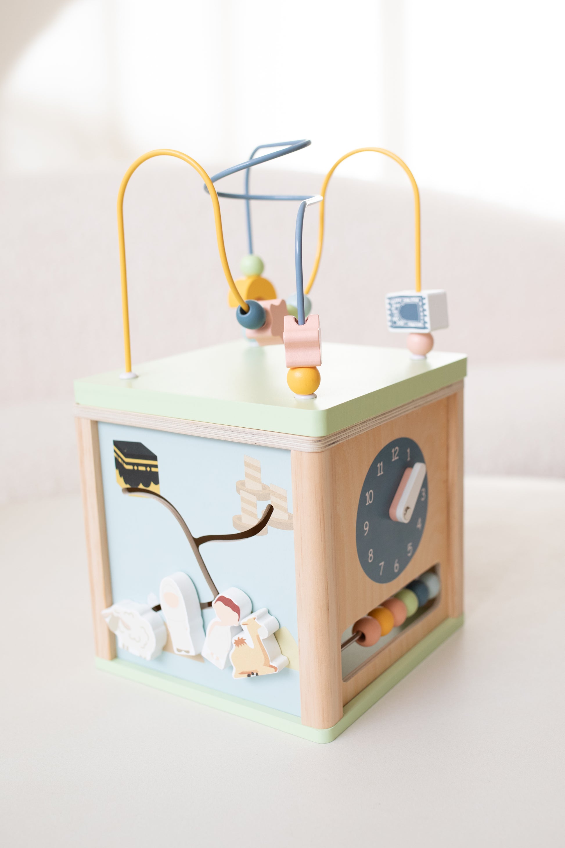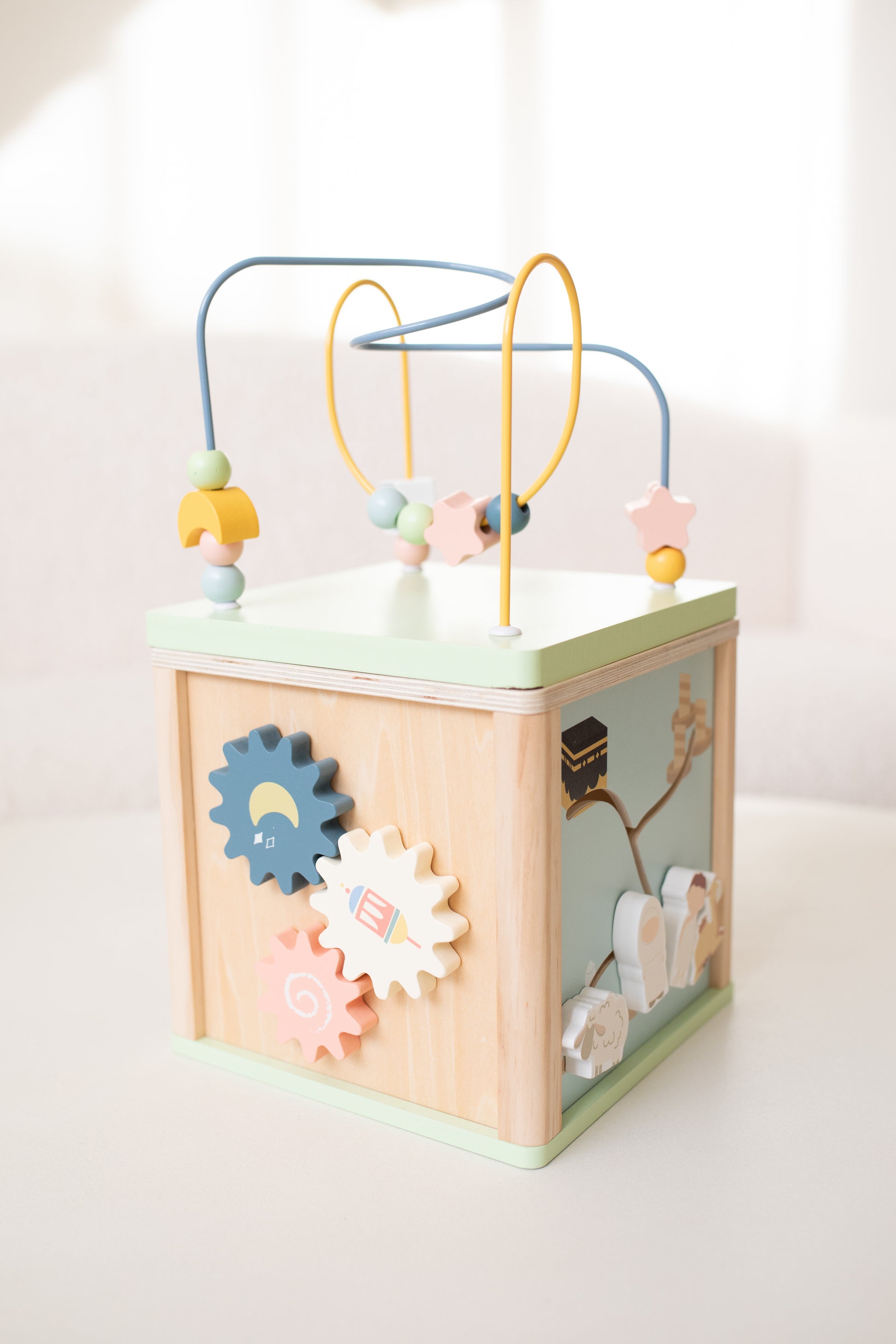 Ontdek de magie van onze activiteiten kubus, een perfecte combinatie van leren en spelen! Deze kleurrijke kubus nodigt kinderen uit tot avontuur en stimuleert hun motorische en cognitieve ontwikkeling. Met speelse kralen die over de draad glijden, draaiende tandwielen en unieke vormen, biedt elke zijde van de kubus iets nieuws en uitdagends.