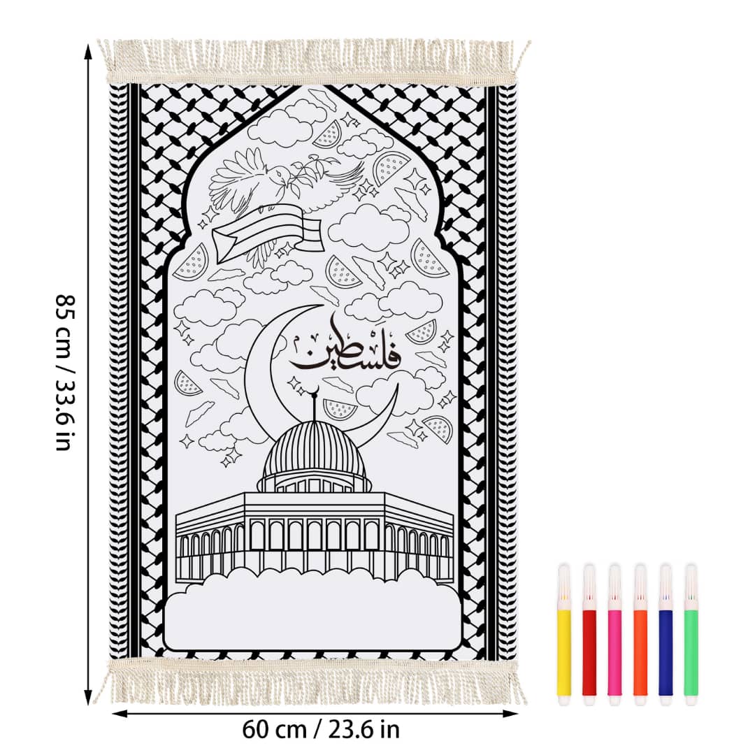 Laat je kinderen op een speelse manier kennismaken met hun gebedsroutine met ons unieke, inkleurbare gebedskleedje. Dit speciale kleedje is ontworpen voor jonge gelovigen en biedt een creatieve benadering van gebed. Het prachtige zwart-witte ontwerp toont de Al Aqsa Masjid in Palestina, waardoor kinderen niet alleen hun gebed leren, maar ook meer te weten komen over deze belangrijke plaats.