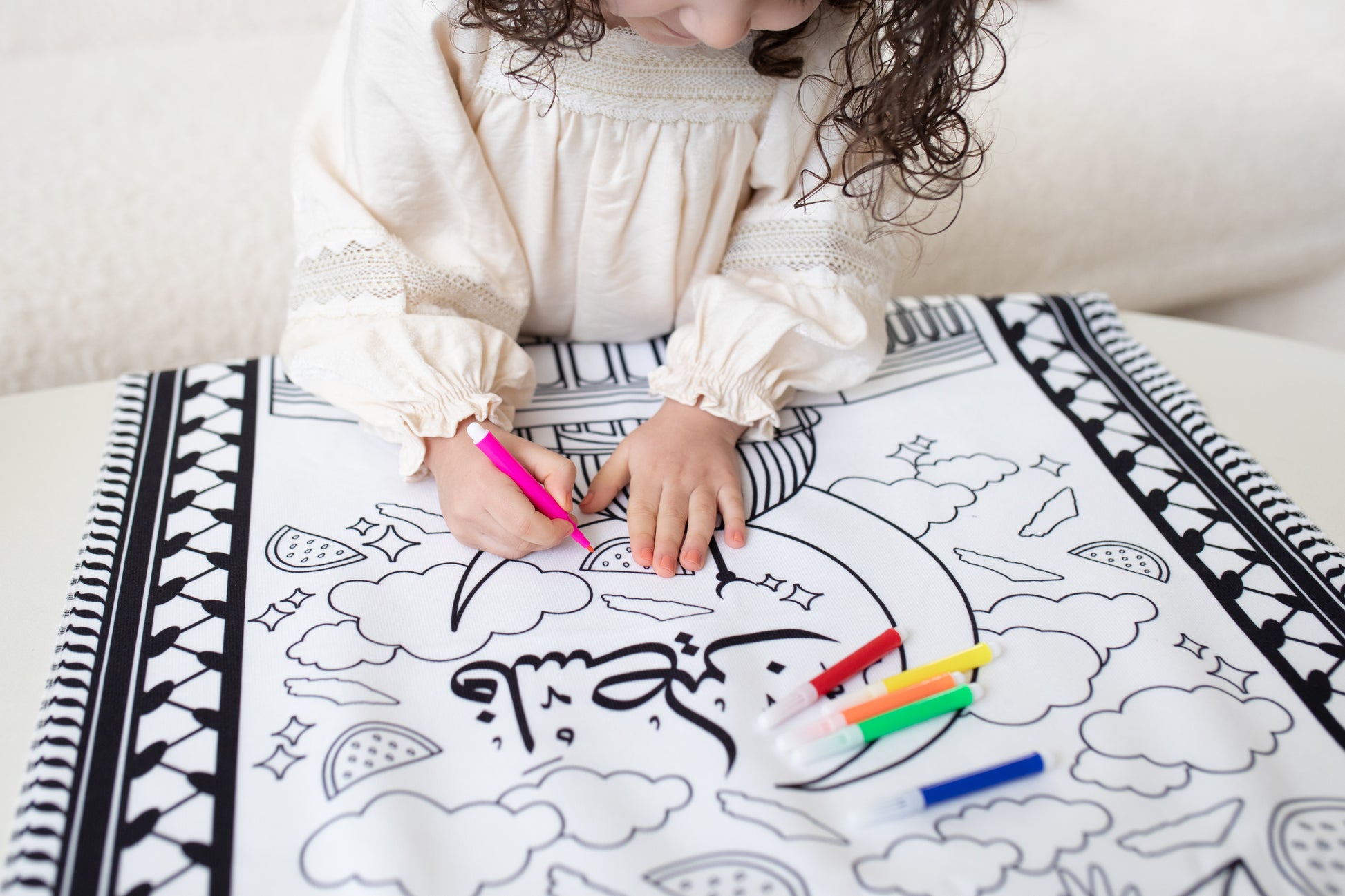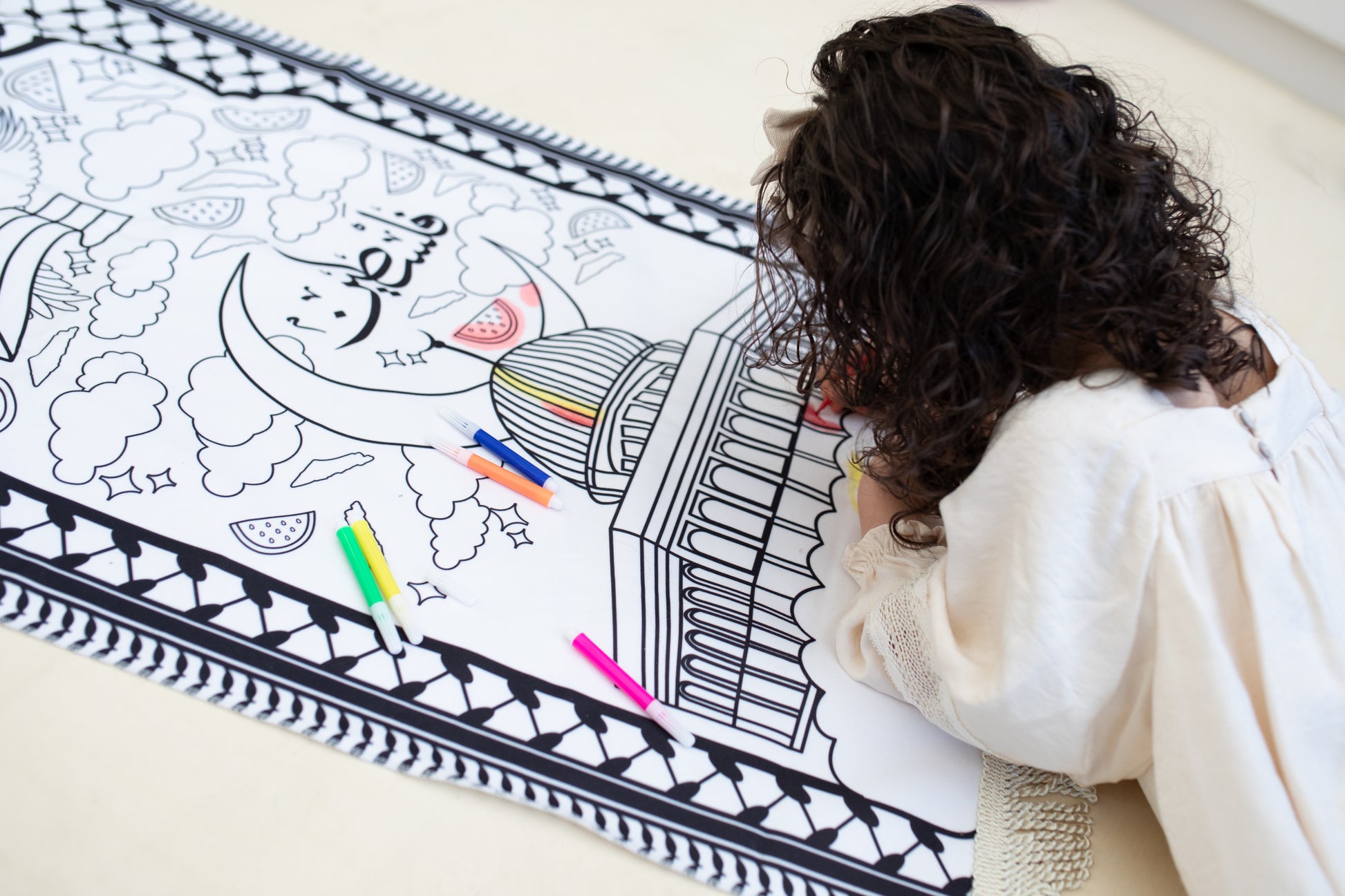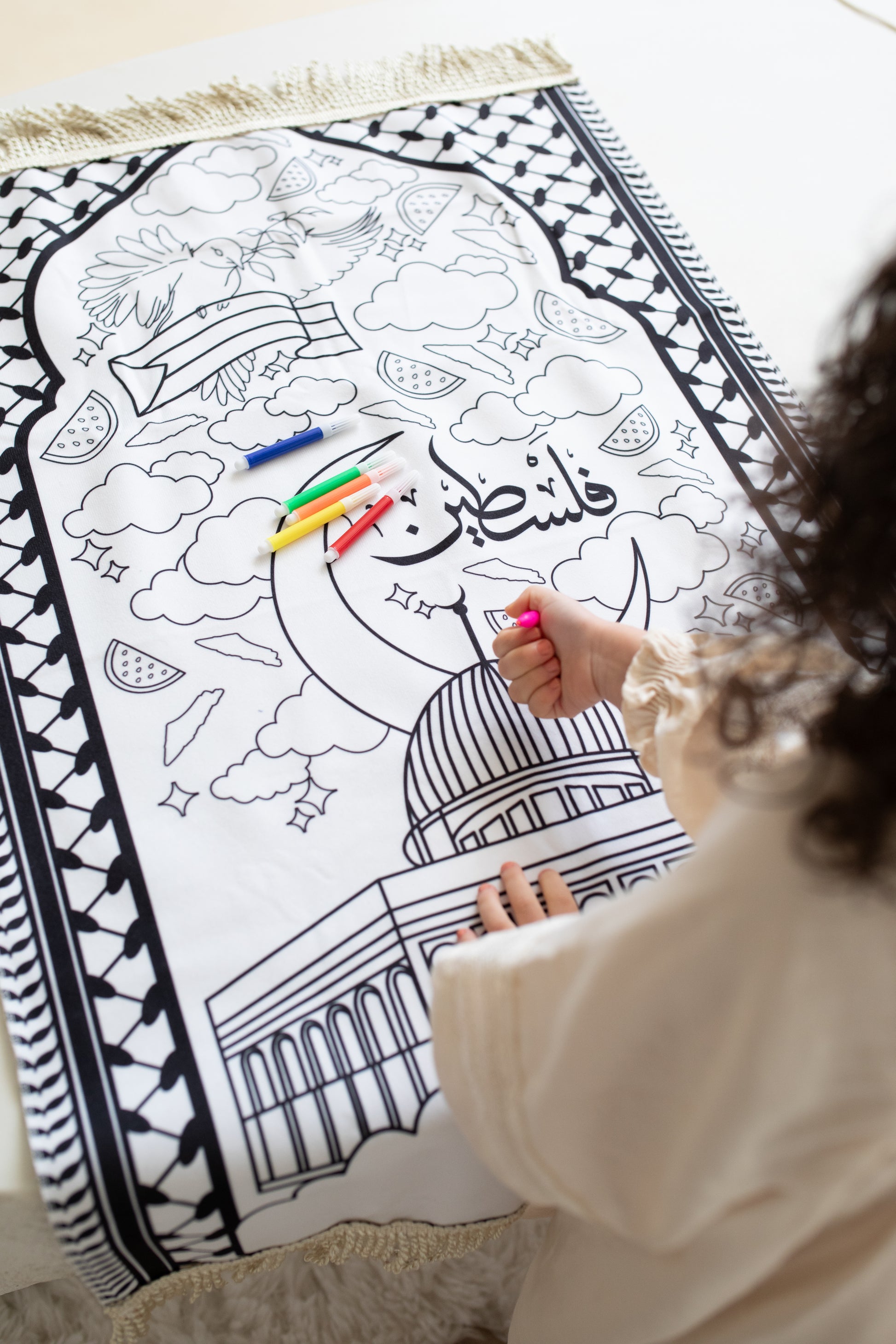 Met de bijgeleverde zes kleurrijke stiften kunnen ze hun creativiteit de vrije loop laten en het kleedje personaliseren. Dit lichtgewicht kleedje is eenvoudig mee te nemen, zodat het perfect is voor gebruik thuis of onderweg. Maak het gebed een bijzondere en creatieve ervaring voor je kinderen met dit inspirerende, inkleurbare gebedskleedje!