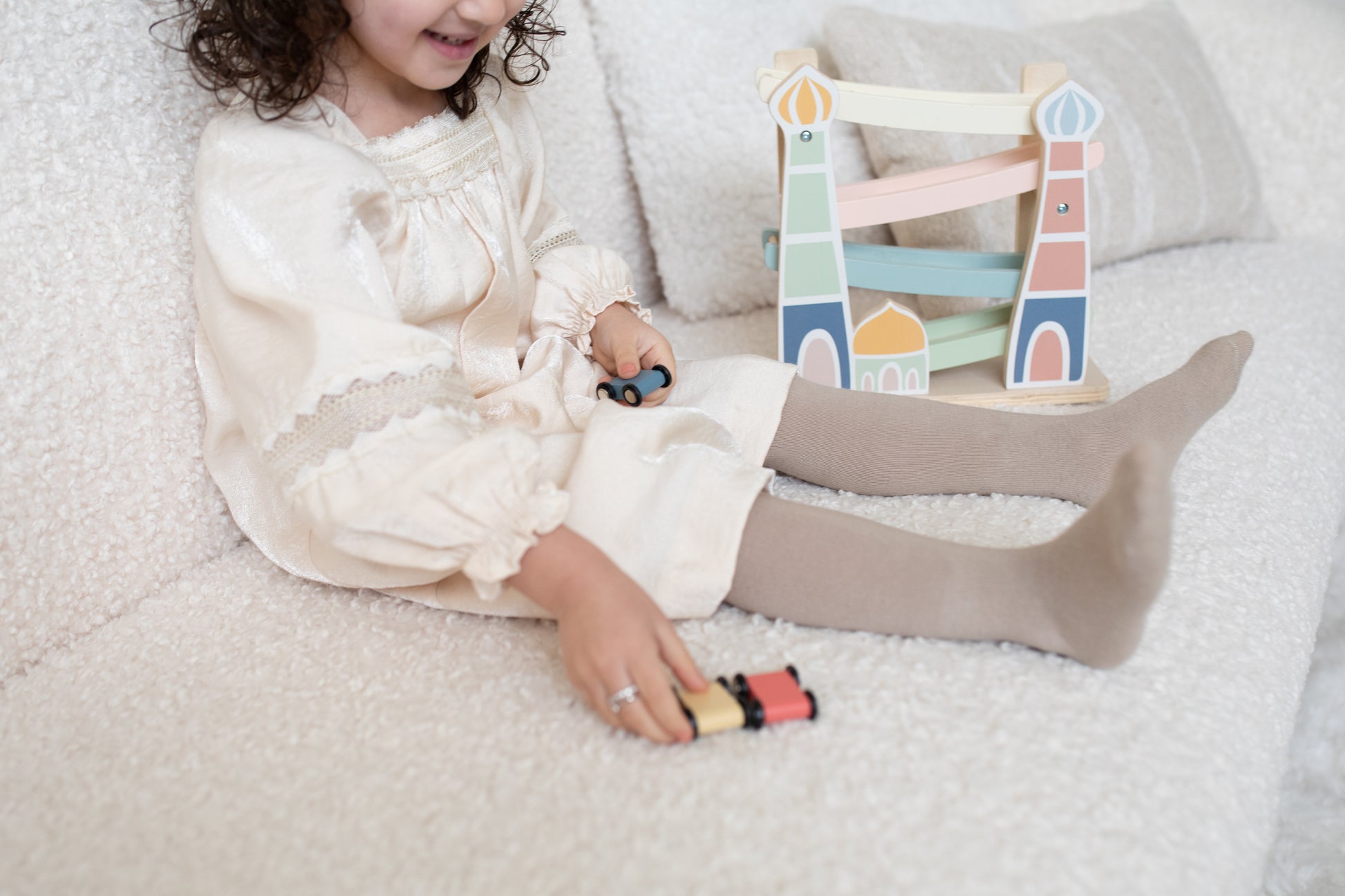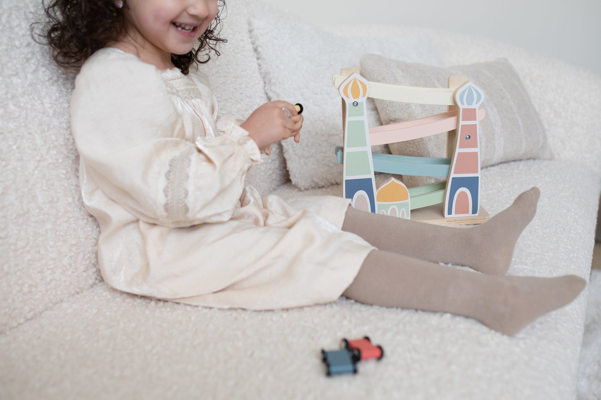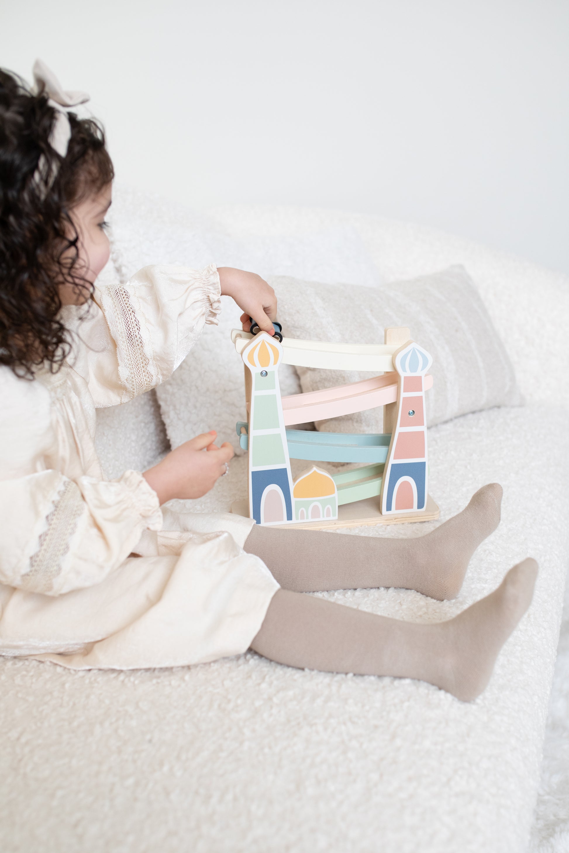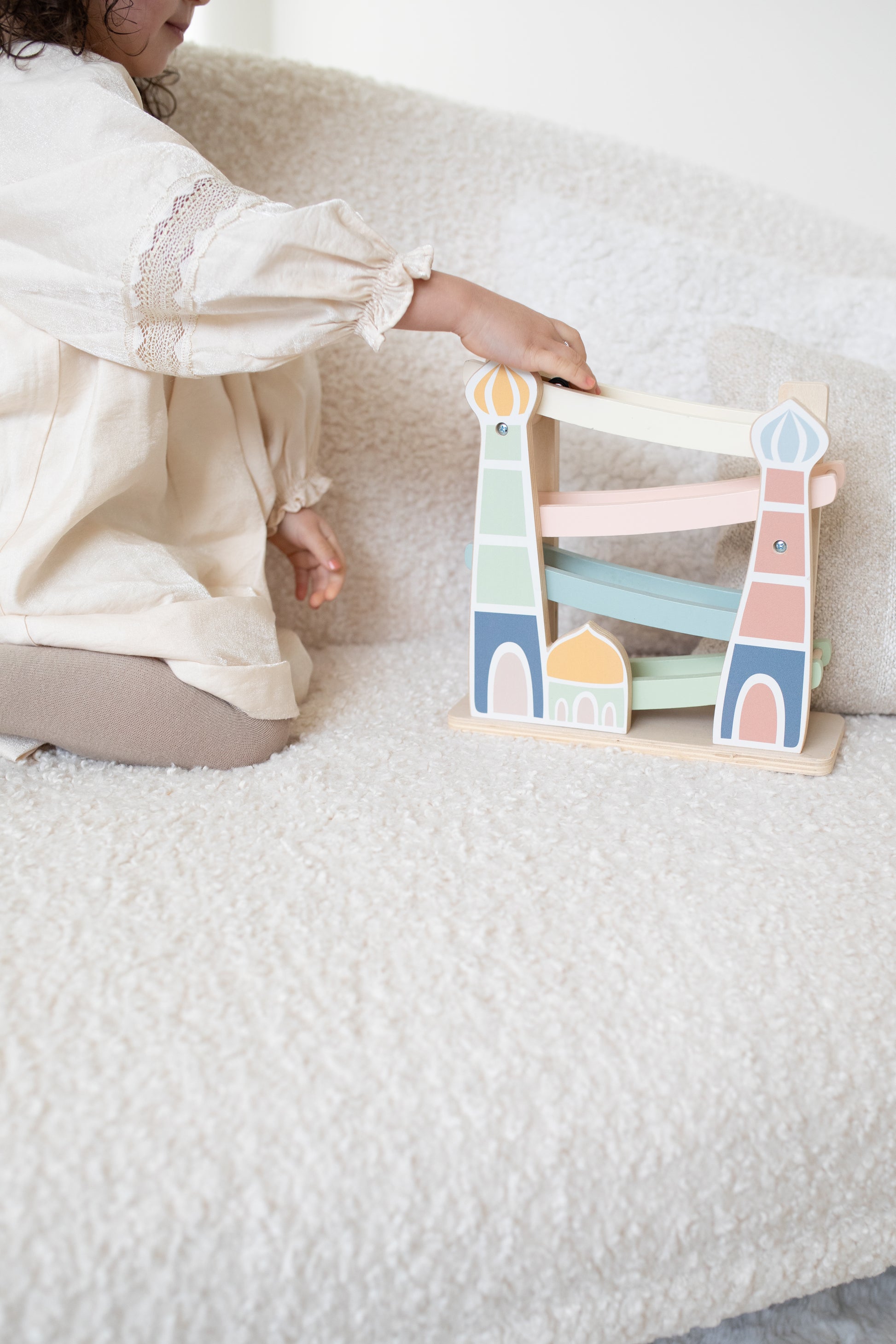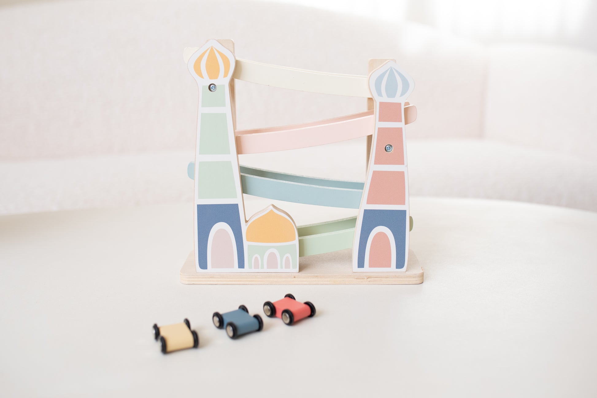 Op tijd naar de Masjid voor het gebed? Dat kan alleen met deze Car Ramp! 3, 2, 1... racen maar! Met deze vrolijke houten autobaan, inclusief drie auto’s, vermaakt je kleintje zich prima. Zet de auto’s één voor één bovenop de racebaan, laat ze los en kijk hoe ze naar beneden racen. Kinderen vinden dit geweldig!