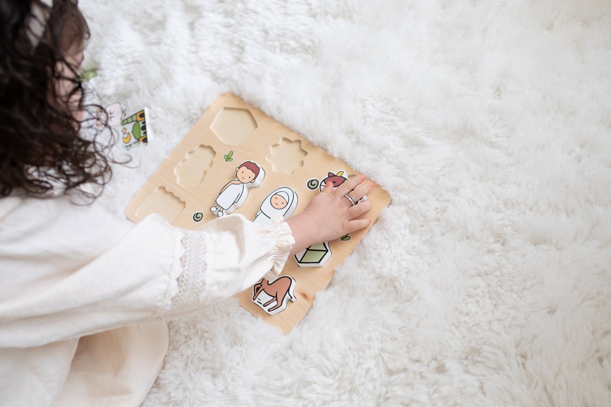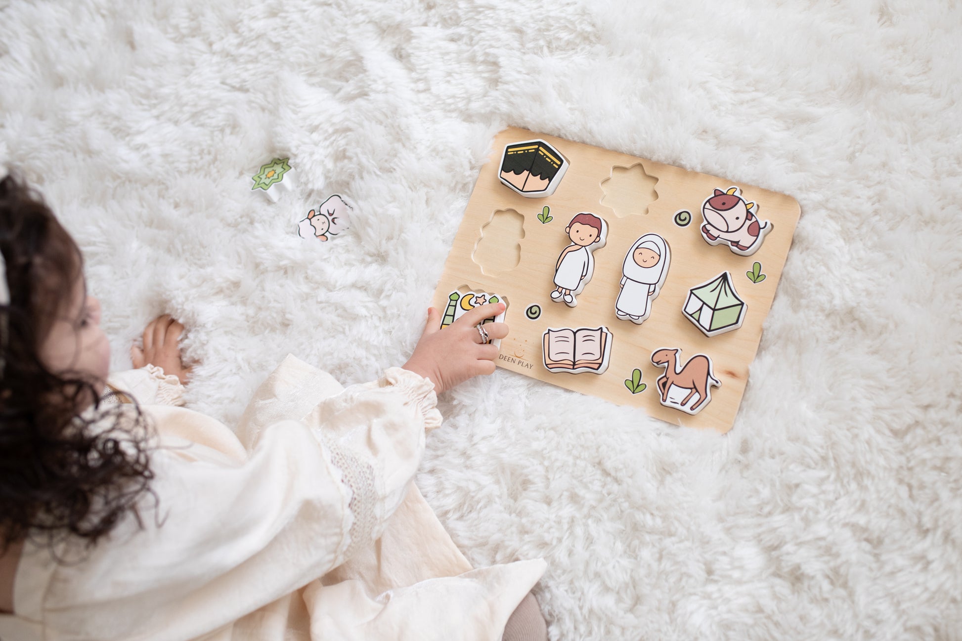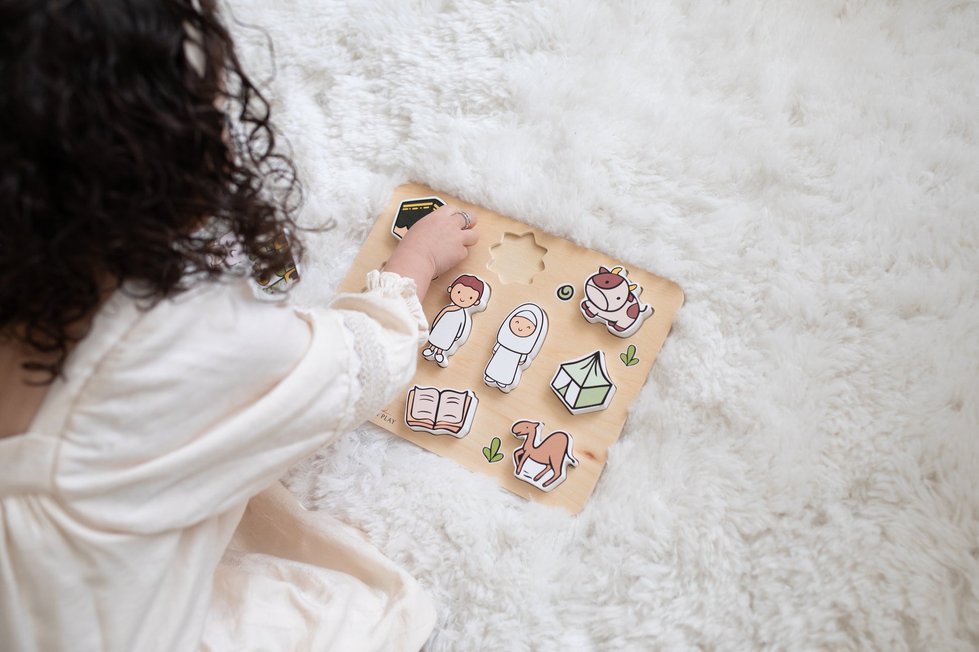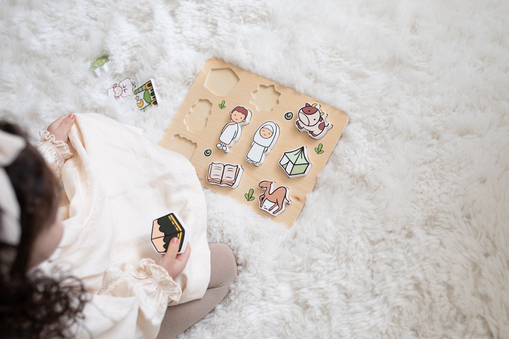 A handmade wooden puzzle that introduces your child to Hajj through play. This educational toy presents the important elements of pilgrimage in a child-friendly way, with ten colorful puzzle pieces featuring large pegs perfect for little hands.