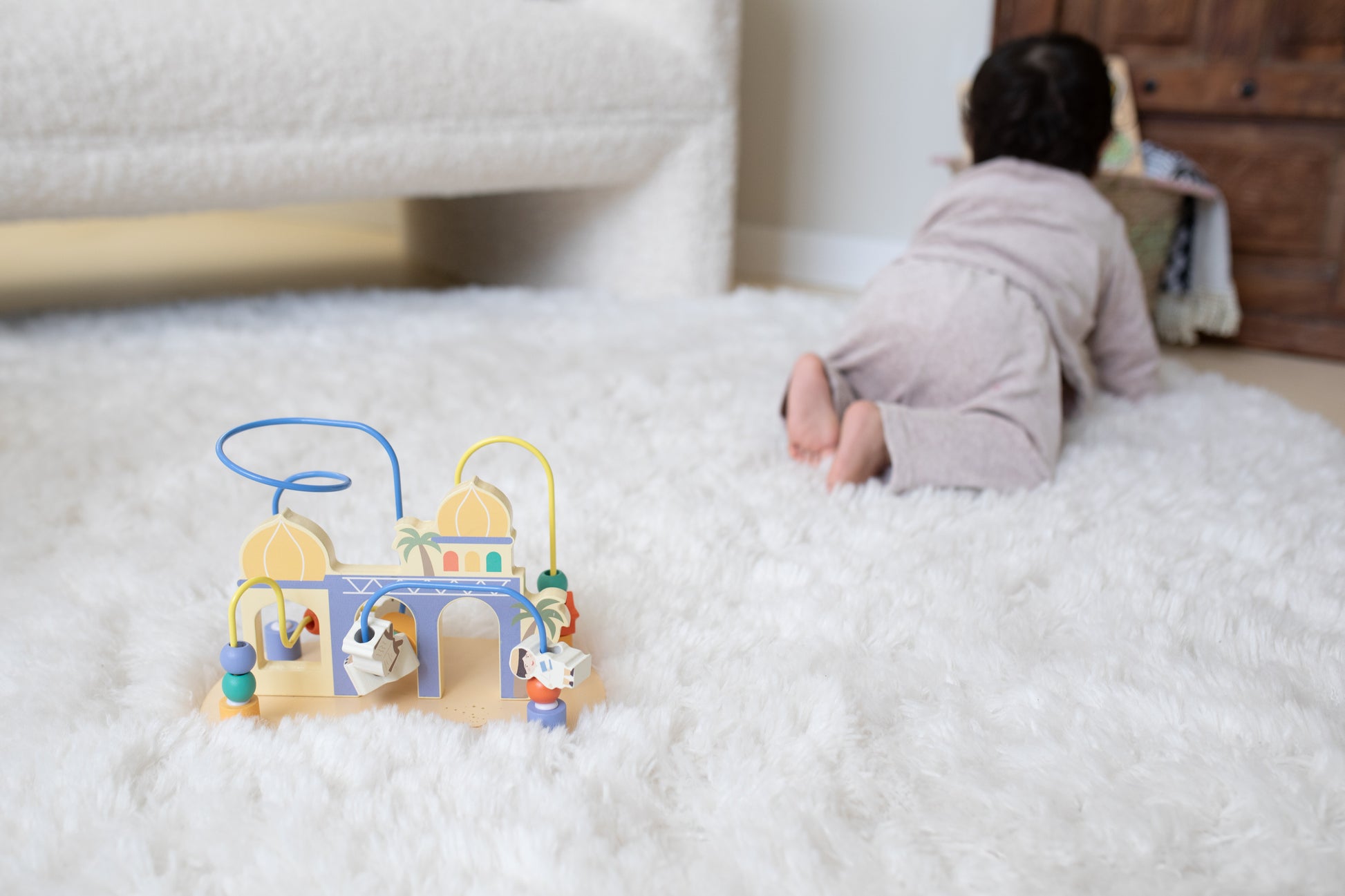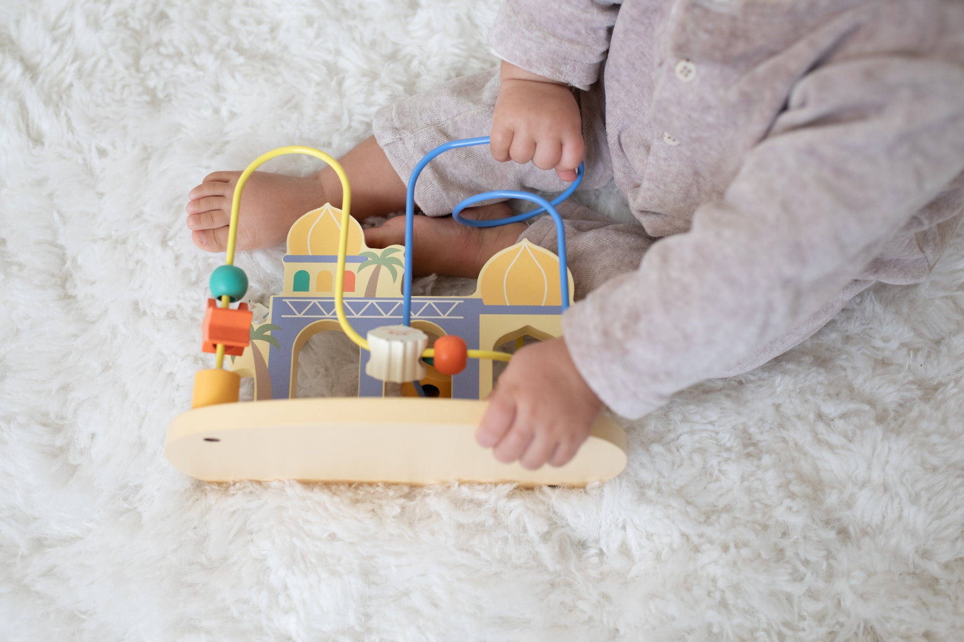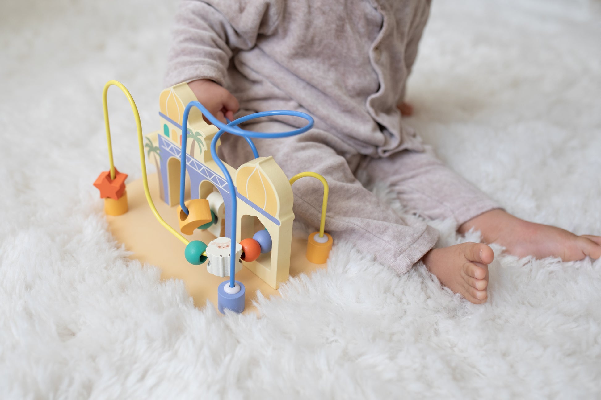 This handcrafted wooden bead and motor skills track combines playtime with cultural elements. The colorful beads glide smoothly along various tracks, passing by minarets, domes, and mosque gates. The small figurines add a storytelling element—perfect for learning through play.